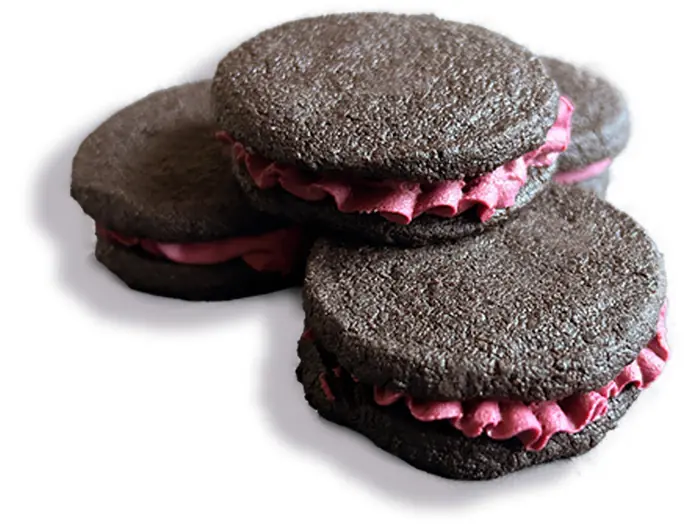 Ingredients: butter, all purpose flour, sugar, black chocolate powder, dark chocolate powder, espresso powder, baking soda, salt filling - butter, crisco, powdered sugar, BERRYActiv5® powder